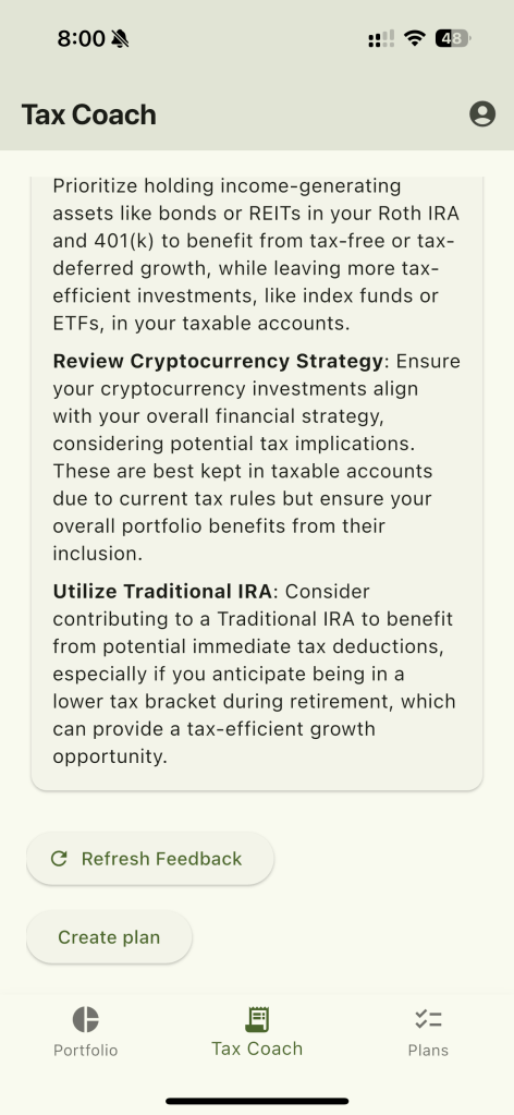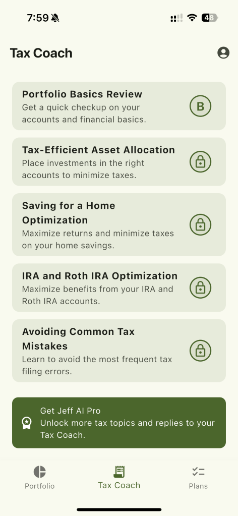 Whether you’re just getting started or looking to optimize your situation, Jeff gives you step-by-step advice tailored to your income, accounts, and goals. It’s like having a financial coach in your pocket, always ready to help you save more and worry less.